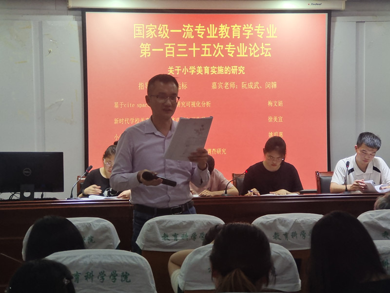此次专业论坛梅文娟小组围绕“关于小学美育实施的研究”的热点主题展开探讨。第一位汇报人梅文娟以《基于cite space的我国美育研究可视化分析》为题,通过对美育相关文献的发文量、作者群、机构合作网络、美育关键词四个方面进行可视化分析,进而把握我国美育研究的基础概况、热点以及研究内容的发展趋势。第二位汇报人徐美宣根据《新时代学校美育政策的文本内涵与工作导向》的主题展开汇报,深入分析新时代美育政策的指导思想及基本原则、总体目标和具体内容,从而指出新时代美育工作的理念导向与实施导向。第三位汇报人姚明惠以《小学美育课程实施现状的调查研究》为题,从学校美育的环境建设、课程实施路径、设施设备建设、学生主观感受和学生客观变化五个维度展开深入研究。