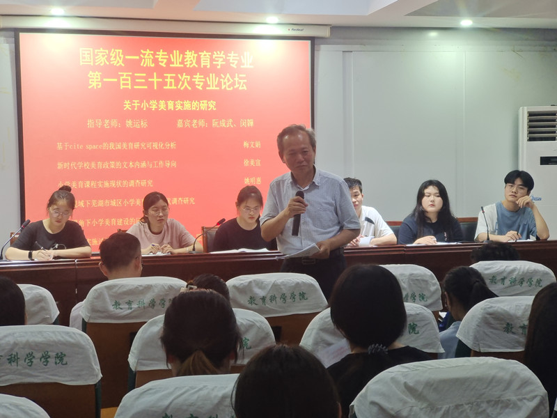 第四位汇报人严中然以《环境视域下芜湖市城区小学美育实施现状调查研究》的主题展开汇报,从物质环境、制度环境、活动环境和精神环境多个维度去调查学校是否充分发挥美育功能。第五位汇报人张妮以《学生视角下小学美育建设的问题研究》为题,采用问卷法与访谈法,指出小学美育建设存在的问题,分析背后原因并提出相应的建议。第六位汇报人张红创根据《小学美育实施过程中美育教师主体性存在的问题、原因及建构策略》的主题展开汇报,指出学校要从完善“理智取向”教师教育模式,建立科学的校内美育教学评价机制等方面继续改进。