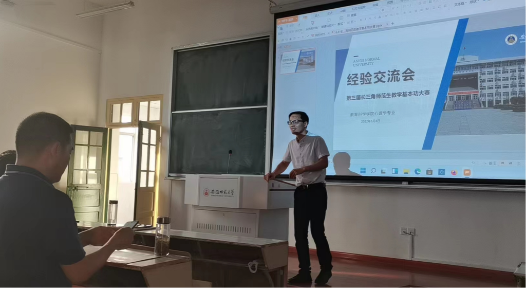本网讯(教科院 唐小菲) 为了进一步提升心理学专业师范生的教学能力,提高心理学人才培养质量,6月8日下午4时,心理学专业在教学楼1401教室召开长三角师范生教学基本功大赛经验分享会。会议由心理学专业负责人王礼军副教授主持,学院教学院长韩建涛副教授、部分心理学专业教师以及20和21级心理学专业共200余名学生参与会议。