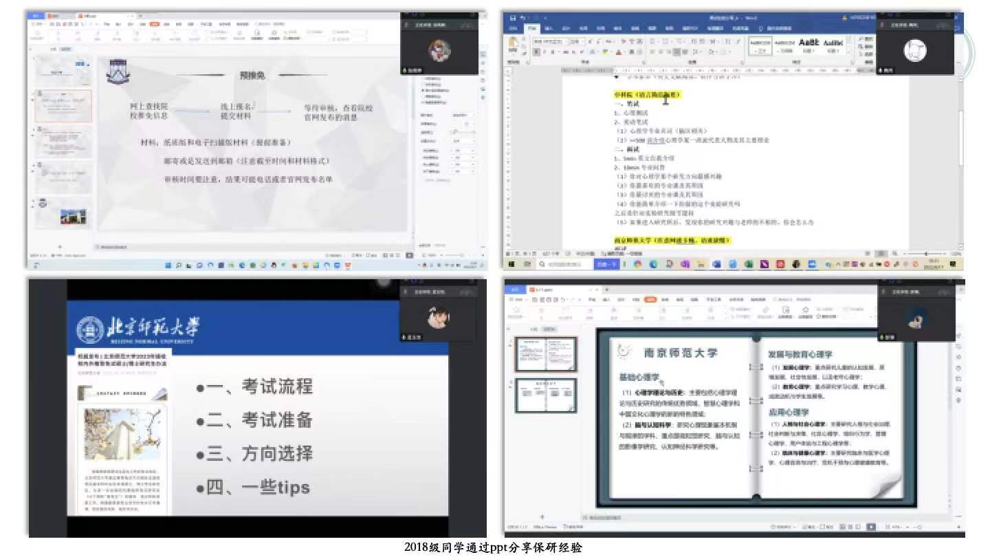 活动伊始,王礼军老师向大家介绍了五位2018级同学研究生阶段就读的院校与现状,并对五位同学能抽出时间准备并参加此次会议表示感谢。随后,陶芮、孟雨洁、王雨荷、张雨婷、彭澜五位同学依次分享了自己的经验,详细地讲解了不同学校的预推免流程,并且真诚地向2019级的同学提出了宝贵意见。分享结束后,2019级同学也就自身准备过程中所遇到的问题进行了提问,王礼军老师和五位2018级的同学对提问进行了详细地解答。最后,王礼军老师就五位同学提出的经验与建议进行了总结,并对2019级即将预推免复试的同学表达了殷切的期望和衷心的祝福。