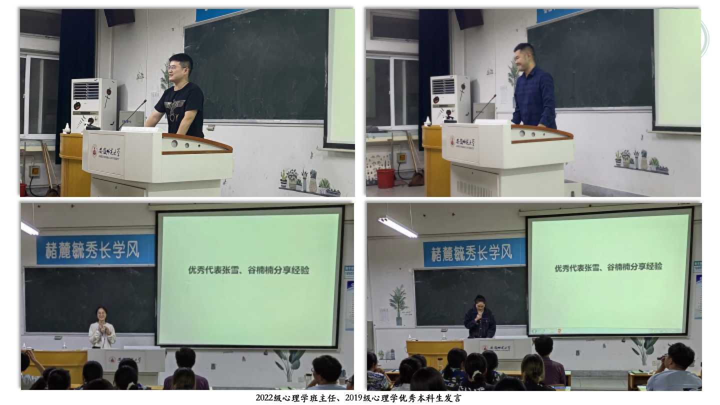 会议也邀请了22级心理学本科生班主任谢宇、万振东以及2019级心理学优秀本科生张雪、谷楠楠,并依次进行了发言。两位班主任从老师的角度对同学们提出了要求与期望,也表示了自己会帮助同学们一同进步的决心。两位2019级心理学本科生从自身的学习经历出发,真诚地分享了自己在科研、学习、生活等多个方面等经历,并结合自身情况与专业发展提出了相应的建议。