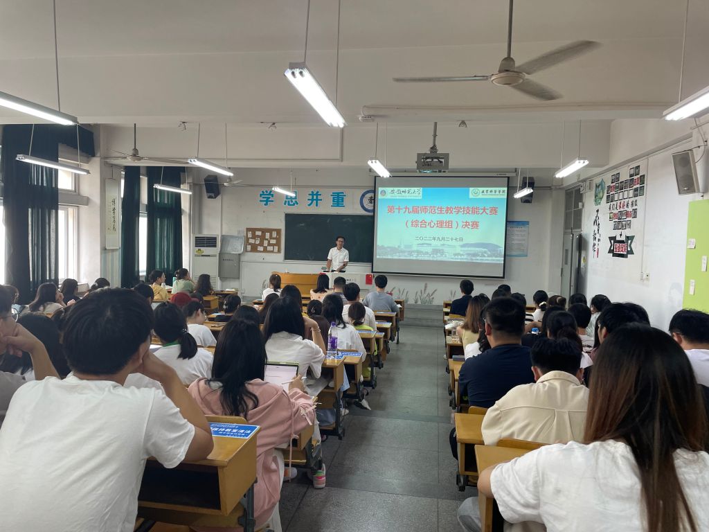 经过前期各导师组内比拼、一线专家评审筛选,最终确定9名同学进入决赛。比赛在教学设计的基础上分为说课和无生上课两个环节。在整个比赛过程中,参赛同学准备充分,讲课方式灵活多样,展现出教学的魅力和吸引力。整场比赛既有板书的传统教学,也有现代多媒体的展示;既有课堂游戏的生动活泼,也有师生模拟互动的思想共鸣。9位同学展示了心理学专业师范生的独特风采和创新精神,赢得了与会师生的阵阵掌声。