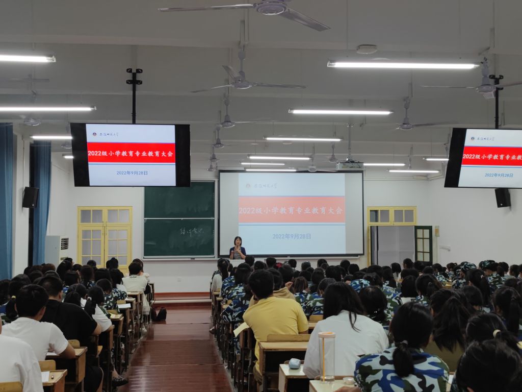 本网讯(教科院 刘子怡)9月28日晚7:00,教育科学学院在教学楼1401教室召开2022级小学教育(全科型)专业教育大会,专业负责人王芳老师,班主任陈元龙老师、吴颖老师和杨俊铨老师,9位班导生和2021级优秀学长、学姐代表以及2022级小学教育专业全体新生参加大会。大会由王芳老师主持。