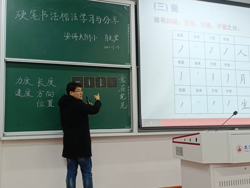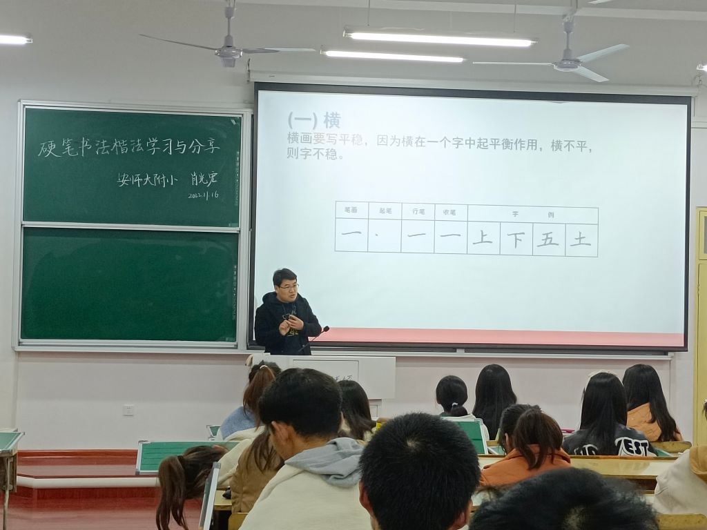 本网讯(教科院 张玉婵)11月16日晚,在专业负责人陈娜老师的组织策划下,2021级小学教育(复合型)专业在教学楼1401教室举办硬笔书法楷书练习交流活动。活动邀请附小书法教师肖光宏作书法练习专题讲座,分享楷书练习经验和技巧。2021级小学教育(复合型)专业、2021级教育学专业全体学生参加此次活动。活动由辅导员赵茜老师主持。