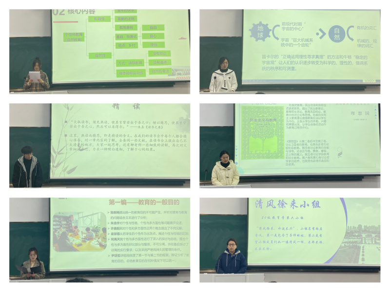 第八组是周兴国老师指导的“缘缘堂”小组,汇报人王可展示了小组情况、读书活动、调研活动以及其他活动和成果。第九组是徐群老师指导的“清风徐来”小组,汇报人李思佳从成员介绍、小组活动和收获感悟三个角度进行分享。第十组是路宝利老师指导的“勤时明月”小组,汇报人纪岚围绕小组介绍、读书活动、教育调查和小组总结展开汇报。第十一组是段兆兵老师指导的“饮冰”小组,汇报人陶继燕以小组介绍、读书活动、学术学习为顺序进行汇报。第十二组是李卯老师指导的“尚昕”小组,汇报人马祎曼介绍了小组信息、读书情况、专业论坛、教育调查和小组活动。第十三组是杨晓奇老师指导的“浅陌初心”小组,汇报人王悦晓从小组介绍、组内活动和反思展望三个方面进行说明。