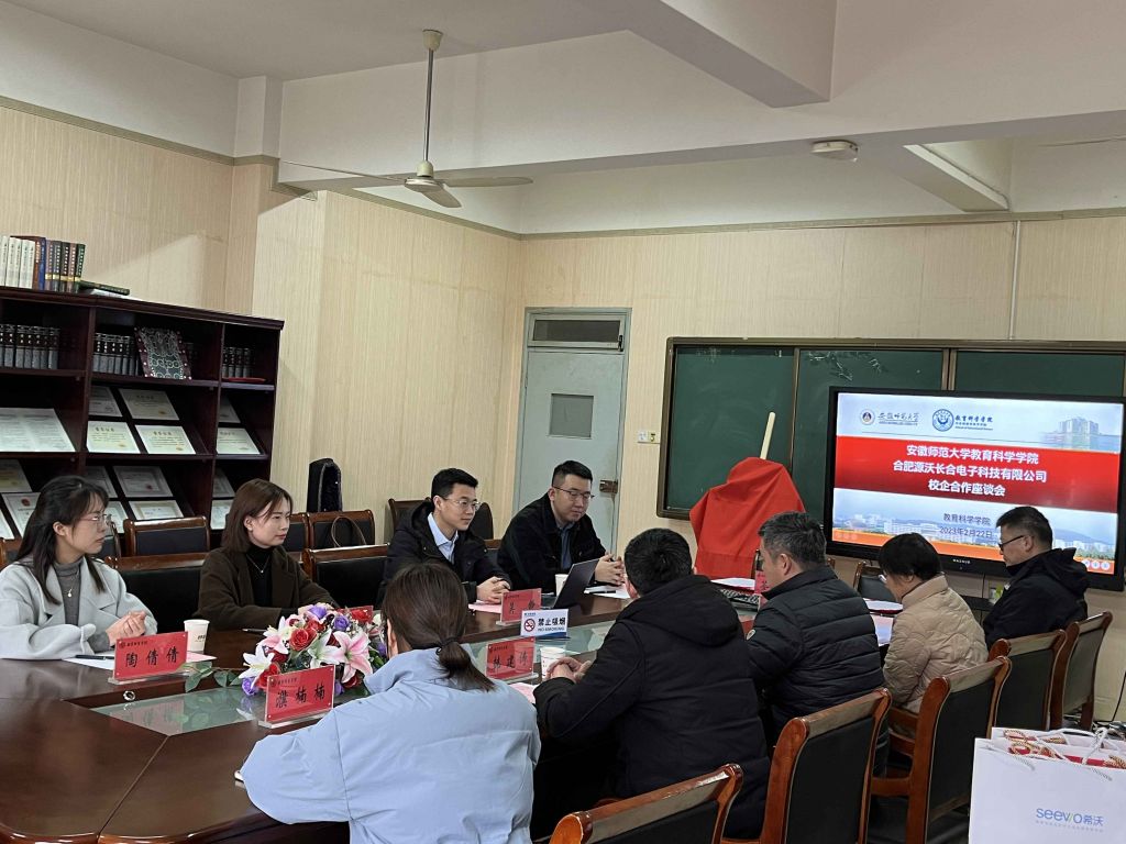 本网讯(教科院)2月22日下午14:00,我院在田家炳教育书院B座408会议室召开与合肥源沃长合电子科技有限公司的校企合作座谈会。合肥源沃长合电子科技有限公司营销平台总经理吴铮,营销平台经理方超,校园服务经理殷培培,市场经理陶倩倩,学院院长李宜江,副院长韩建涛,教育技术系肖文、袁晓斌、濮楠楠等教师参加了座谈会。