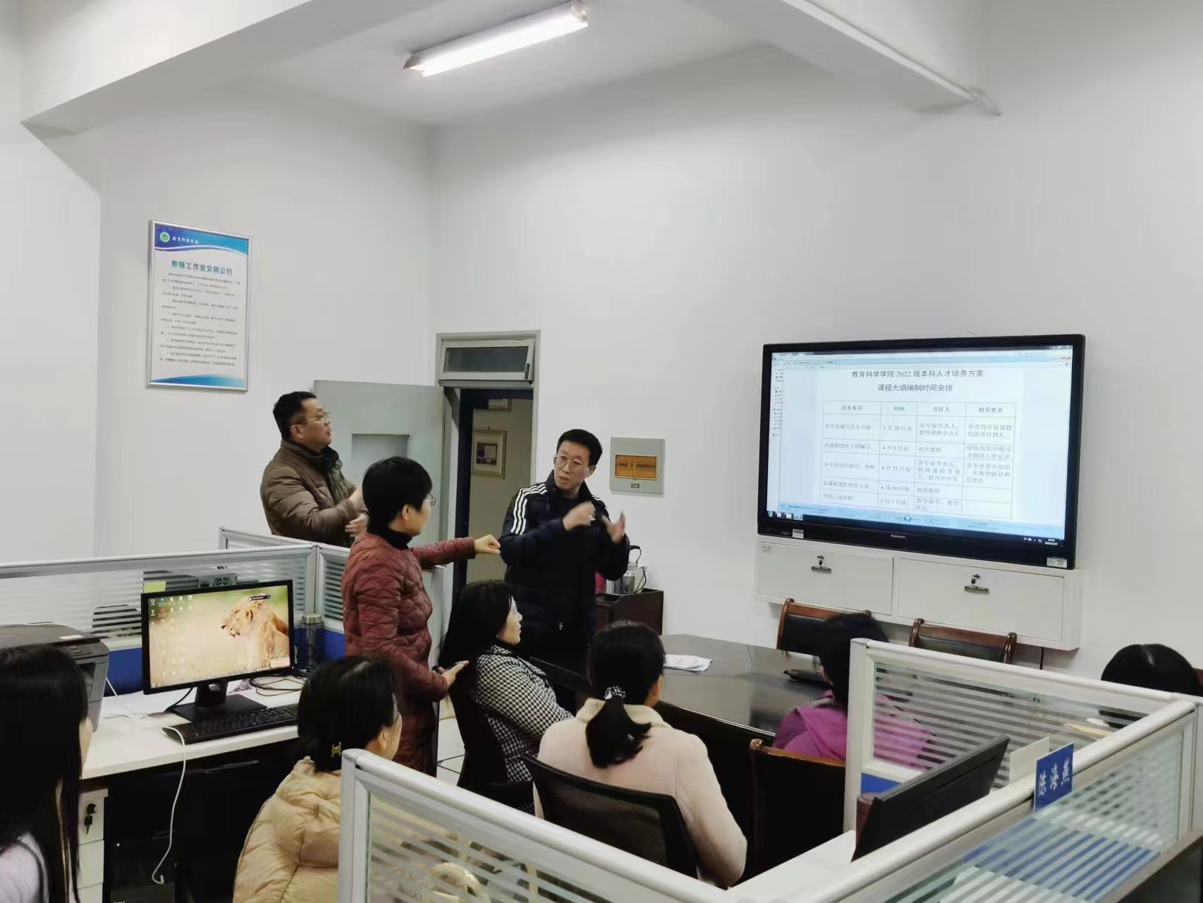 本网讯(教科院)3月22日下午,在学前专业教研室召开学前教育专业2022版大纲编制研讨会,学前教育专业全体教师与会,会议由学前教育专业负责人王成刚主持。
