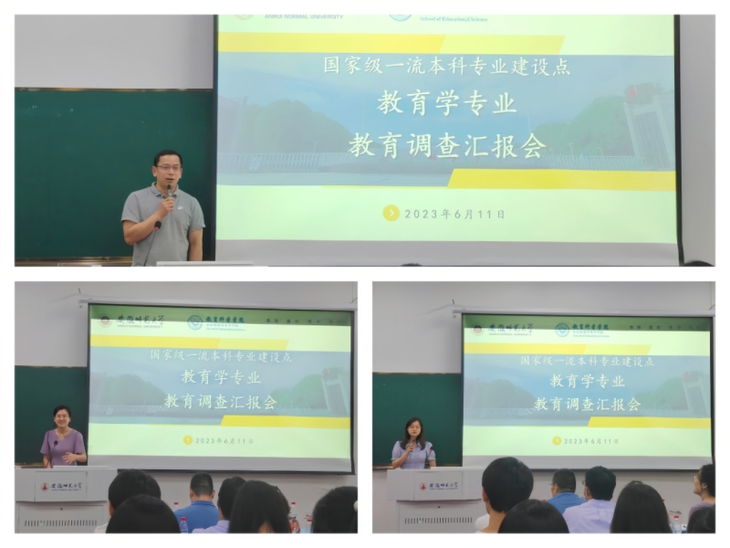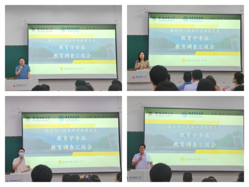 6月11日晚,国家级一流本科专业建设点教育学专业在教学楼1108教室成功举办《教育调查》汇报会。小组指导教师段兆兵、杨晓奇、徐赟、柳丽娜、徐群、杨俊铨、陈元龙、课程负责人滕曼曼以及21级辅导员赵茜应邀出席此次活动。20级、21级以及部分22级教育学专业本科生到场参加,并由20级教育学张紫涵担任主持人。