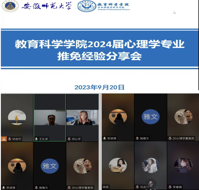为了进一步提高心理学专业推免攻读硕士研究生的水平和质量,帮助心理学子更好地应对推免面试,心理学专业于2023年9月20日晚以腾讯会议的形式线上召开2024届心理学专业推免经验分享会,会议邀请到23届推免保送至北京师范大学、华南师范大学、华中师范大学等高校继续读研深造的优秀毕业生分享宝贵经验。会议由心理学专业负责人王礼军老师主持,获得推免资格的9位20级心理学专业学生参与。