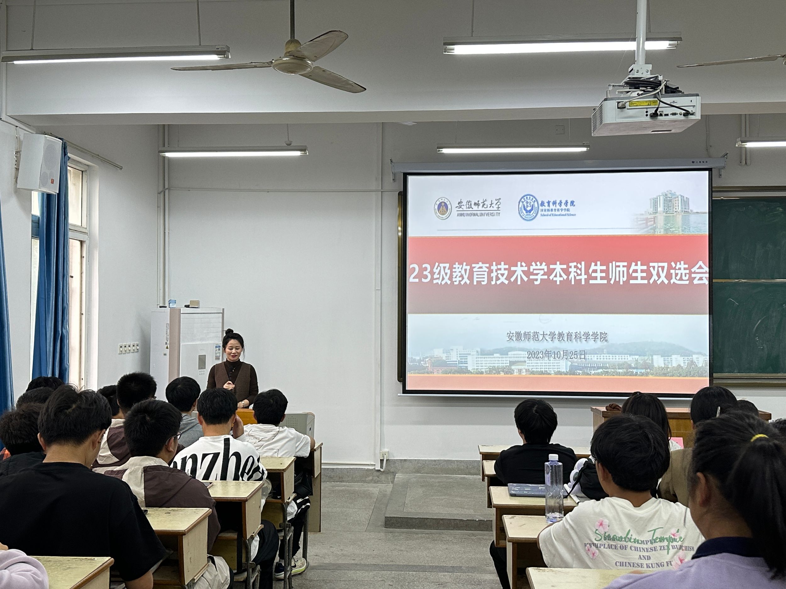 为帮助新生合理规划大学生活,做好导师双选工作,10月25日下午,学院于天门山校区主教学楼106召开2023级教育技术学召开本科生导师双选会。教育技术学专业负责人肖文、班主任白倩、辅导员金凤仙及全体2023级教育技术学本科生参会,会议由肖文主持。