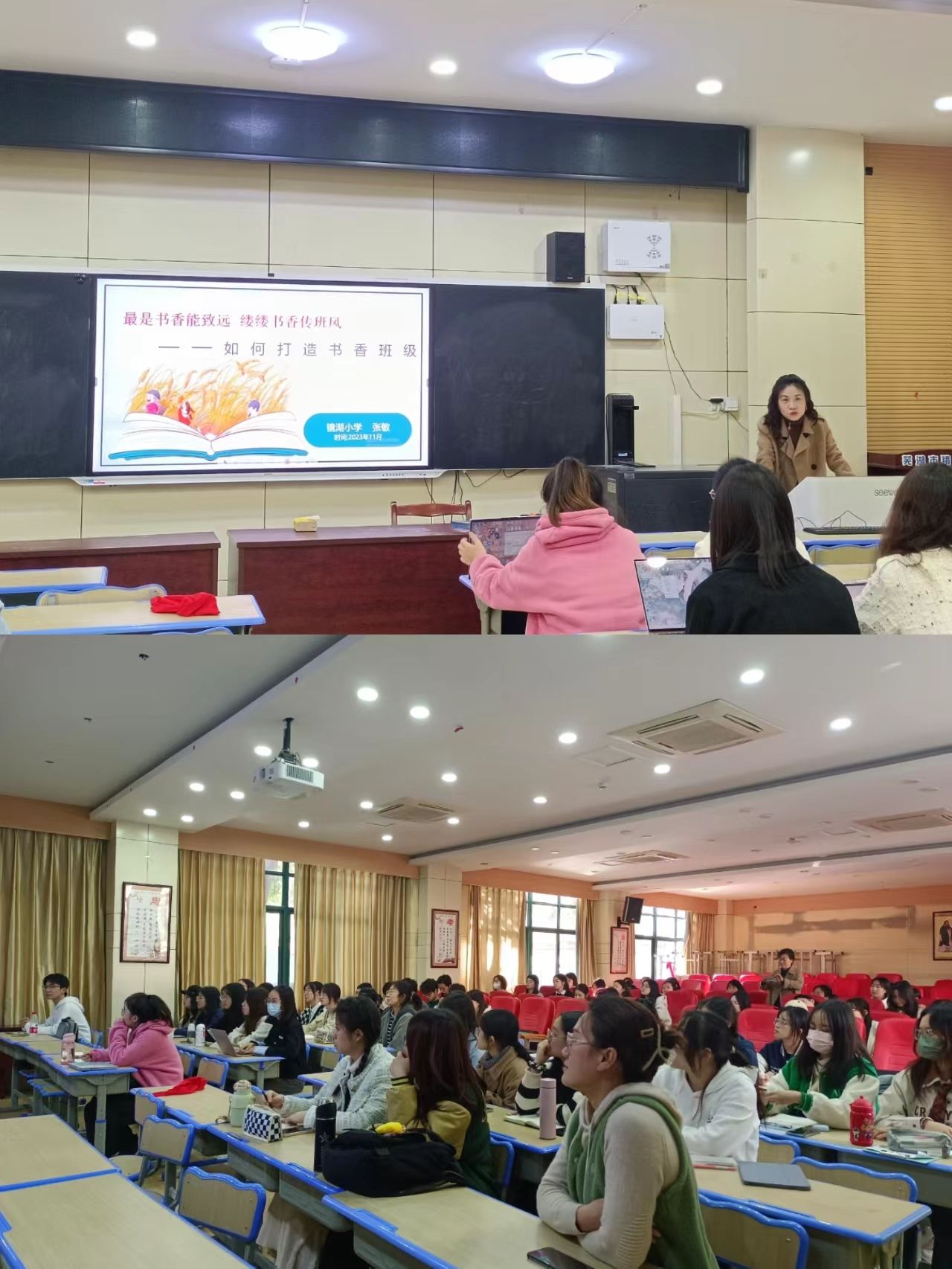 下午,学生集体在湖韵楼阶梯教室参加《书香班级浸润人生》主题讲座,张敏老师从“书香”班级建设的重要性、打造“书香”班级的策略、“书香”班级的创建成果以及“书香”班级建设的感悟四个方面进行讲述,以自身所管理的班级为例,分享了自身作为班主任对“书香”班级建设的方法、工作经历和经验,层层深入,最后,张老师以“最是书香能致远,缕缕书香传班风”这句话对此次讲座进行总结。