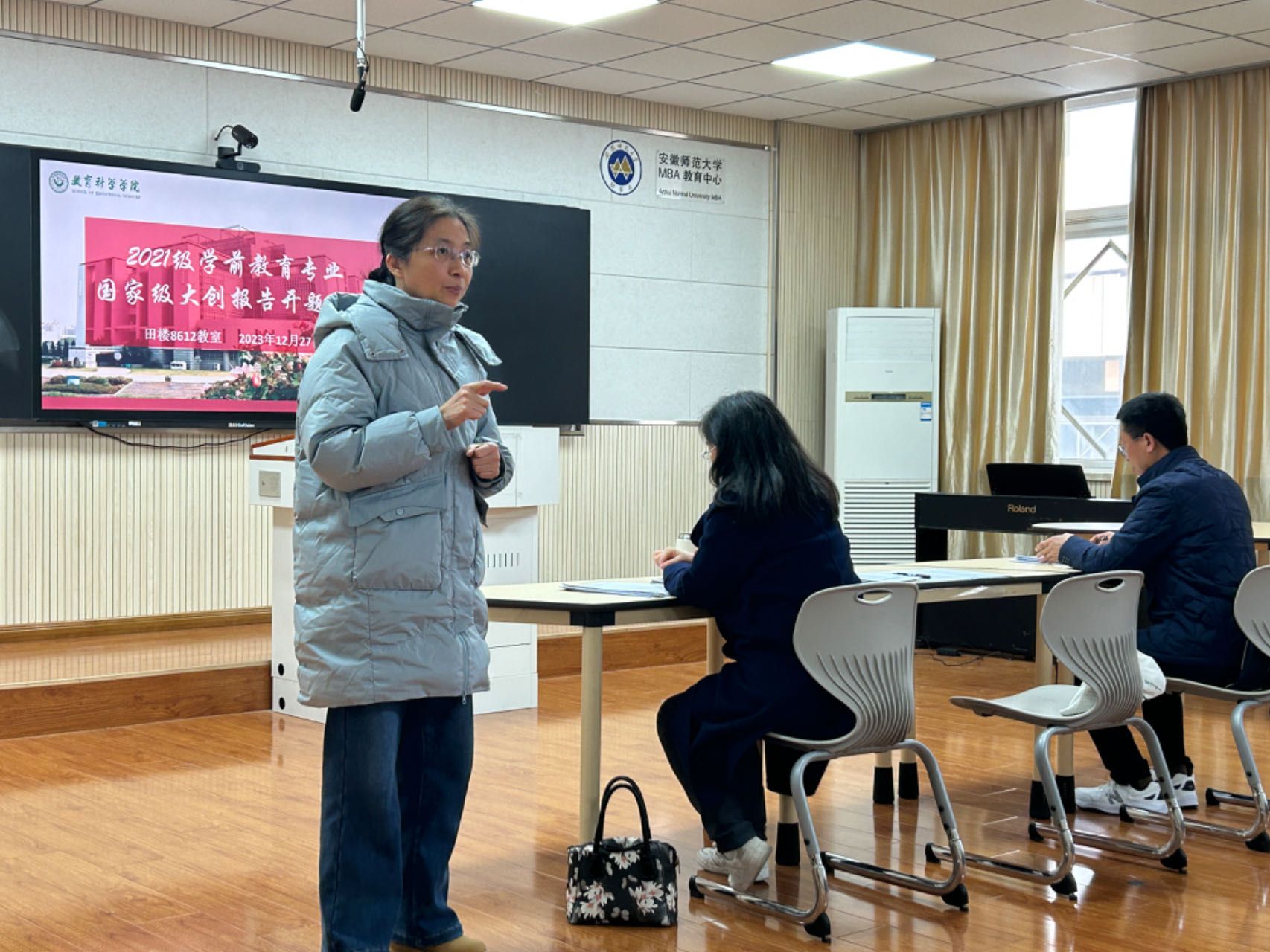 开题汇报的六位成员柳倩芸、何艺、张桐宇、姚薇薇、叶婧、王楠希依次围绕《课后延时服务政策在幼儿园执行的实然现状研究》《乡村振兴背景下幼儿教师激励机制研究——以芜湖地区为例》《大班幼儿眼中的男幼师形象》《“家-园-馆”乡土幼教模式的实践研究》《奥尔夫音乐教育视角下音乐游戏对中班幼儿共情能力的发展研究》《徽州非物质文化遗产融入幼儿园课程的实践研究》展开汇报,项目研究内容覆盖广泛,研究方法各不相同。三位老师在听完每个小组汇报后,分别就相关项目的相关问题展开提问,并针对项目选题的可行性、研究对象的选择、研究方法的使用等方面进行了细致点评与深入指导,为项目成员后续研究的开展指明了改进方向。