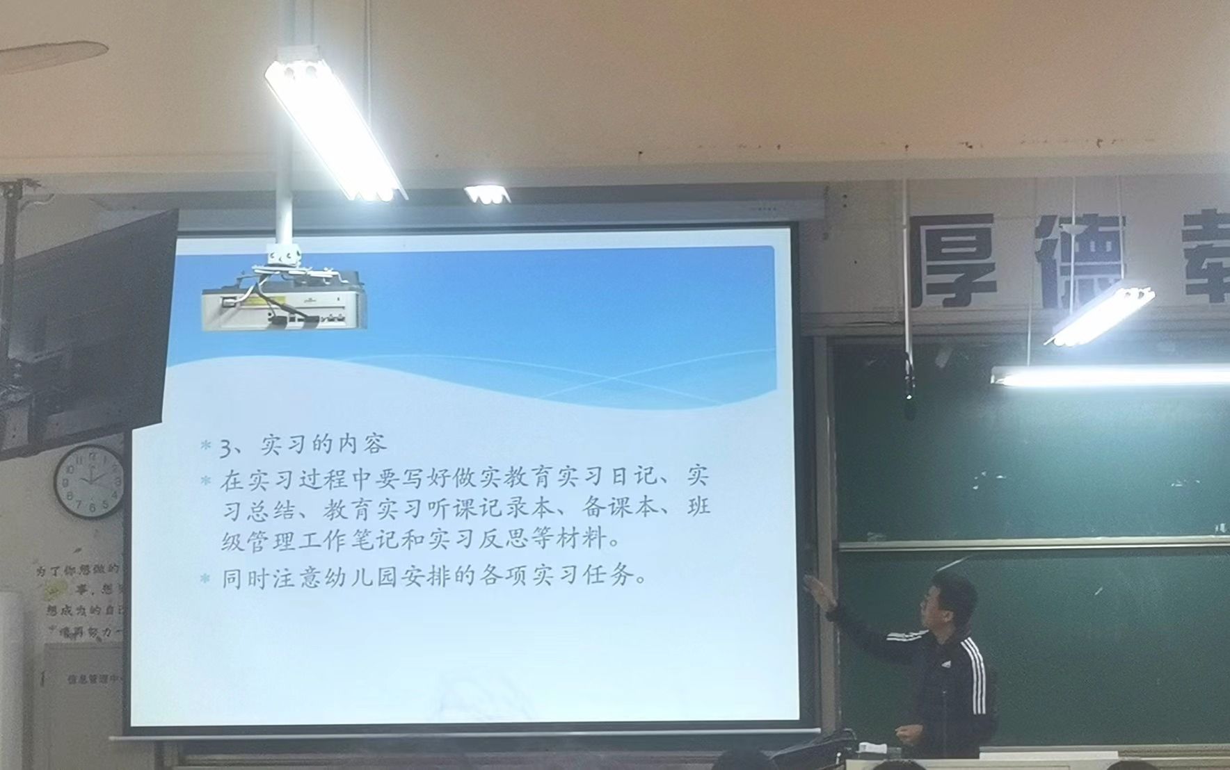 针对实习工作,王成刚老师向学生们介绍了专业实习的重要性和意义,“教育实习是专业知识和专业实践之间共融的桥梁,也是人才培养方案规定的必修课程,同学们认真完成。”并就实习工作具体交代了本次教育实习的安排和要求,具体包括实习的时间安排和内容。本次专业实习起止日期为2月26日-5月31日,共计14周。根据学校实习的要求和总体安排,教育实习过程中要求实习同学写好教育实习日记、实习总结、教育实习听课记录本、备课本、班级管理工作笔记和实习反思等材料,同时注意幼儿园安排的各项实习任务。最后,王成刚老师具体交代了实习注意事项,要求同学们树立安全第一的意识,正确处理实习中存在和可能遇到的各种问题。同时指出要在实习过程中,把专业实习与毕业论文撰写有机结合起来,可在专业实践中收集论文撰写所需的资料。