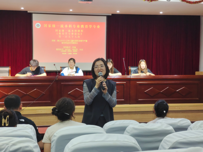 5月12日晚,国家级一流本科专业建设点教育学专业第一百五十七次专业论坛在图书馆报告厅顺利举行。莅临本次专业论坛嘉宾教师有李宜江老师、余秋莉老师、金马妮老师以及徐赟老师和小组指导教师陈晨老师。21级、22级教育学专业全体本科生到场参加,并由22级教育学刘康帅担任主持人。