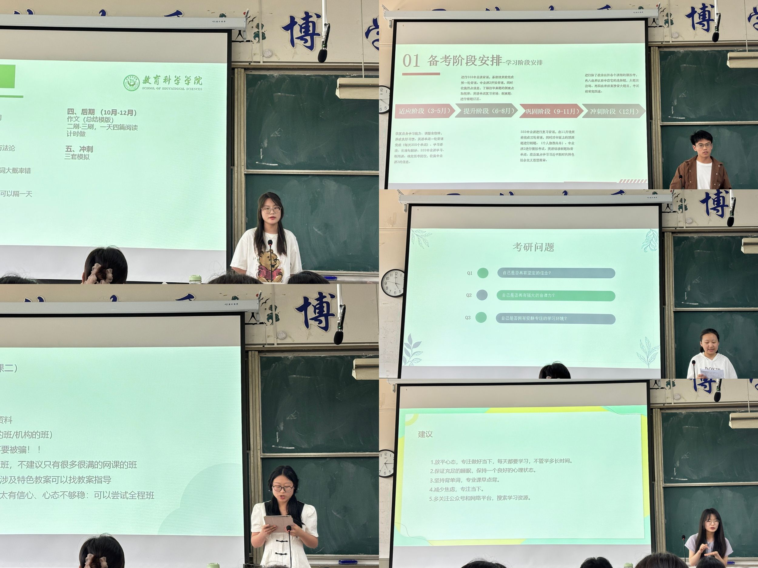 会议伊始,八位考研上岸的学长学姐分别从不同方面依次分享自己的备考经验。考研至华南师范大学学前教育专业的张能瑞分享自己的相关经验,帮助大家明确备考阶段安排,主要分为适应阶段、提升阶段、巩固阶段和冲刺阶段,进一步强调考研英语及专业课的背诵复习,鼓励大家自主选择多种学习方式。考研至苏州大学学科教学(语文)专业的钱佳敏从“考什么、怎么考”两个方面向大家介绍备考技巧,主要包含指导同学们如何查找资料、高效背诵、练习真题与模拟题三个方面。考研至安徽师范大学学前教育学专业的施宇新主要分享了英语一与学硕专业课备考经验,她强调英语单词学习可以灵活使用各类单词软件,每周固定学习英语阅读,寻找属于自己的英语作文答题技巧。在备考专业课时,同学们应针对不同课程制定不同的学习计划,运用记忆编码熟背专业课知识。考研至南京师范大学教师教育专业的张梦洁分享了个人的考研初衷、考研准备、考研过程与考研感悟。“工欲善其事,必先利其器”,她鼓励大家要有坚定的信念、强大的自律能力和安静专注的学习环境。考研至上海师范大学比较教育学专业的方帆向大家介绍选择考研院校的相关经验,提醒大家根据自身水平谨慎报考,并建议大家注重做好当下的事,放平心态,积极应考。