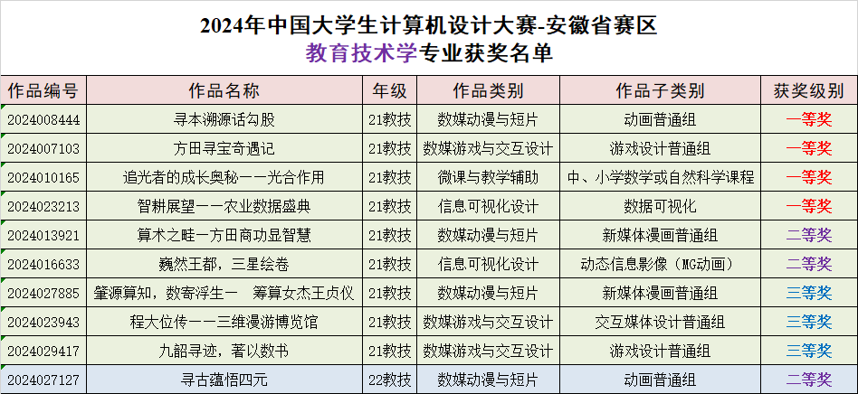 近日,“2024年(第17届)中国大学生计算机设计大赛”安徽省级赛结果出炉。2021级教育技术学本科学子依托教育研习(四)课程全员参赛,产出10件省赛入围作品。经过激烈角逐,9件作品取得了省级三等以上奖项的好成绩,包括省级一等奖4件,二等奖2件,三等奖3件。其中,5件作品获得了入围国赛的资格。