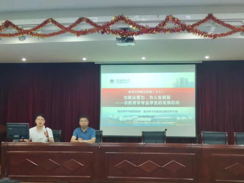 在第十六场《教育改革前沿讲座》中,李广海老师以《为就业蓄力,为人生奠基——谈教育学专业学生的发展趋向》为主题进行汇报。他首先指出教育专业中男女比例失调的问题,他以自身的求学经历为基础,认为此现象与教师的社会地位与收入有关,他提出要改变此现象,首先要提高教师收入,增加教师行业的吸引力。接着,他介绍了教师面对的挑战。第一,教师培养内卷化,如今出生率低下导致教师需求量减少,而培养的教师数量一直增加,使教师行业竞争愈加激烈。第二,教育数字化转型,科技的发展需要教师有现代技术使用能力,并以其辅助教学,使教育的形式多样化。第三,教师需要有教学与科研能力,如今倡导培养科研反思型教师,从日常教学中发现新的研究问题,以教学反哺科研。随后,他提出教育学学生应多读书,读好书。适当看文学作品,多阅读经典著作,提升自己的专业能力与文化涵养。最后,他简要介绍了广西师范大学的环境与学术氛围,期待同学们报考广西师范大学研究生。