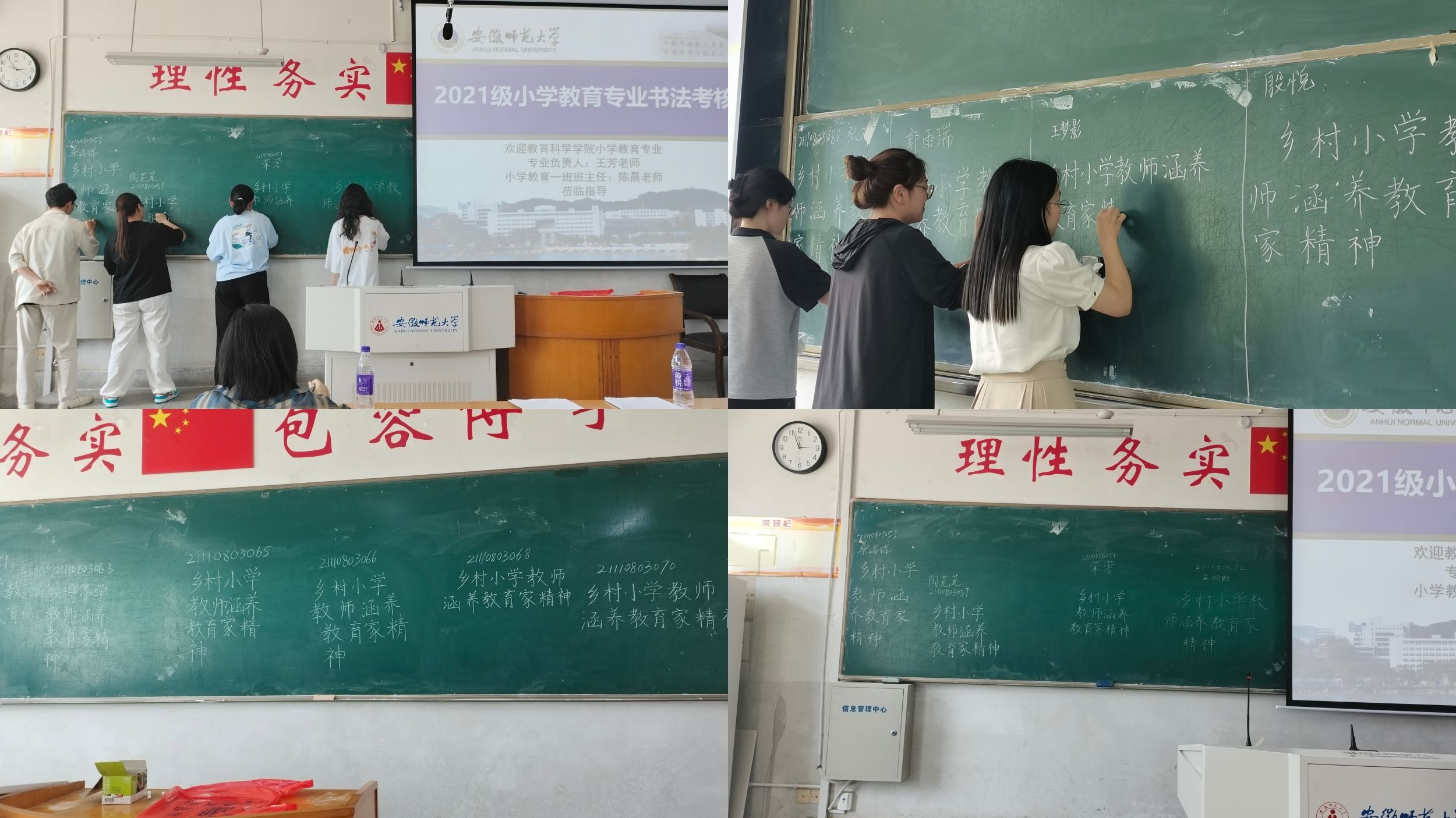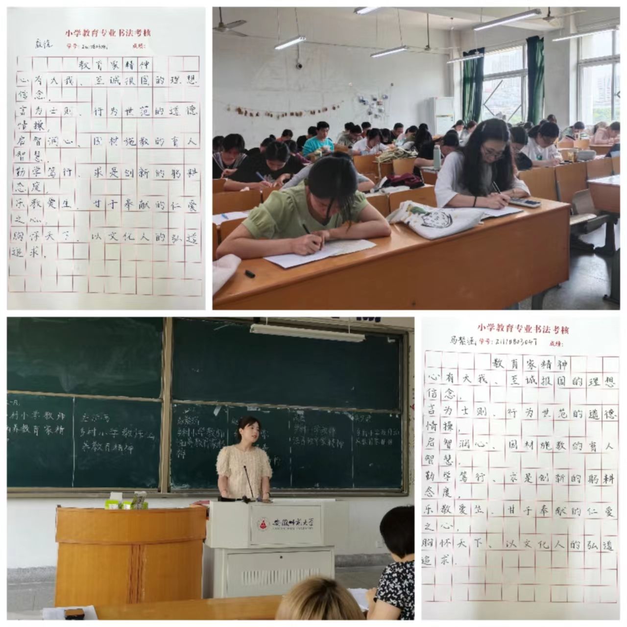 规范、端正、整洁、流利地书写“三笔”字楷书是师范生的基本素质。为进一步规范汉字的书写,培养师范生良好的书写习惯,6月12日下午两点半,2021级小学教育专业全体同学在田楼8201、8202教室举行了书法考核活动。考核活动由小学教育专业负责人王芳老师组织,并邀请学院夏益军老师、陈晨老师、魏晓敏老师共同担任评委。
