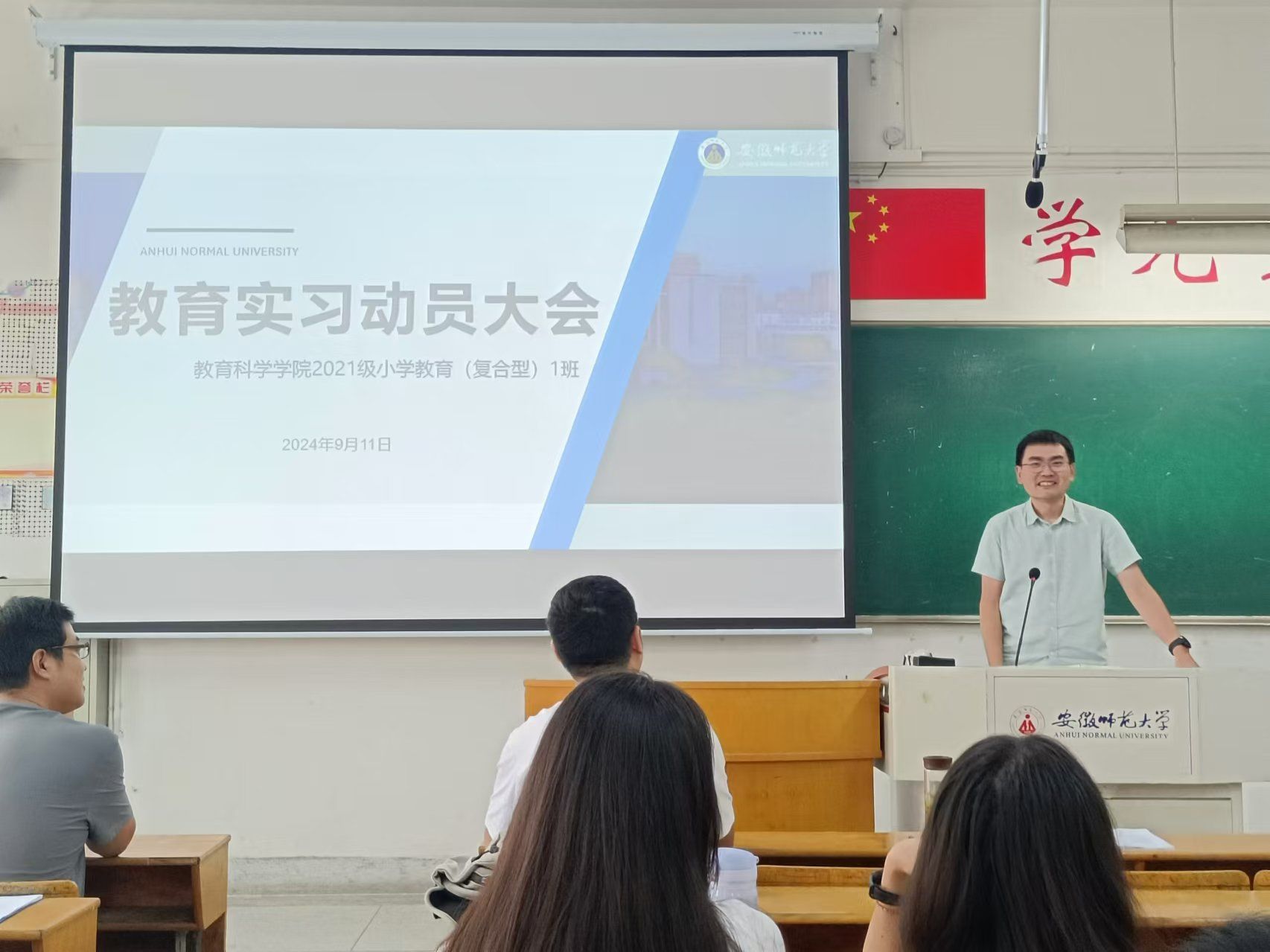 为了增进学生对教育实习的了解,做好相应的实习准备,教育科学学院2021级小学教育(复合型)专业于9月11日下午14:30在赭山校区田楼8309教室开展教育实习动员大会。学院副院长韩建涛,专业负责人杨俊铨,实习指导教师肖龙、刘婉、胡薇、陈元龙,辅导员赵茜,2021级小学教育(复合型)专业全体本科生参与其中。会议由叶格格主持。