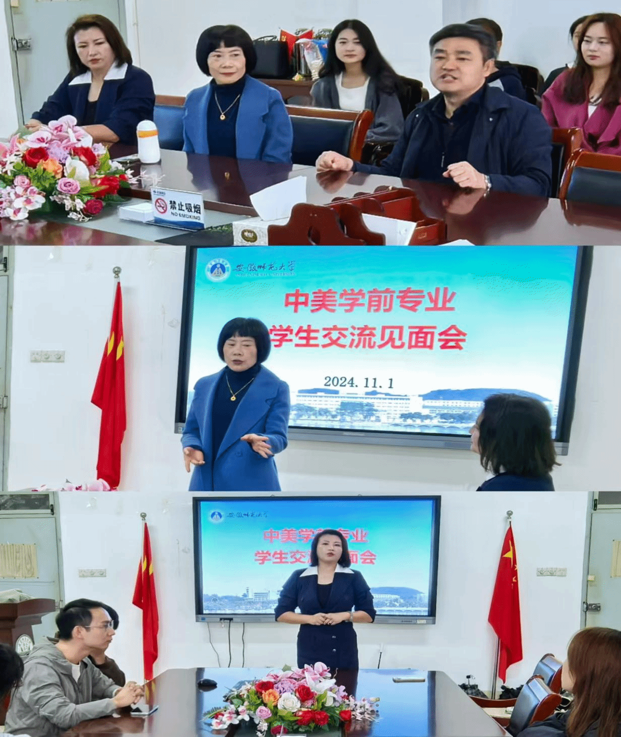 (本网讯 肖子欣) 为提升学生对于美国布莱诺大学的认识,提高未来第四年在美学习效率,破除往昔对于赴美学习的认知壁垒。24学前教育(中外合作)1班于十一月一日上午九点在赭山校区行政楼308会议室进行师生交流见面会。院长李宜江、布莱诺大学国际交流项目负责人叶晴、学前教育专业教师赵学菊、学前教育(中外合作)专业负责人朱言同出席本次会议,24学前教育(中外合作)全体同学与会交流。