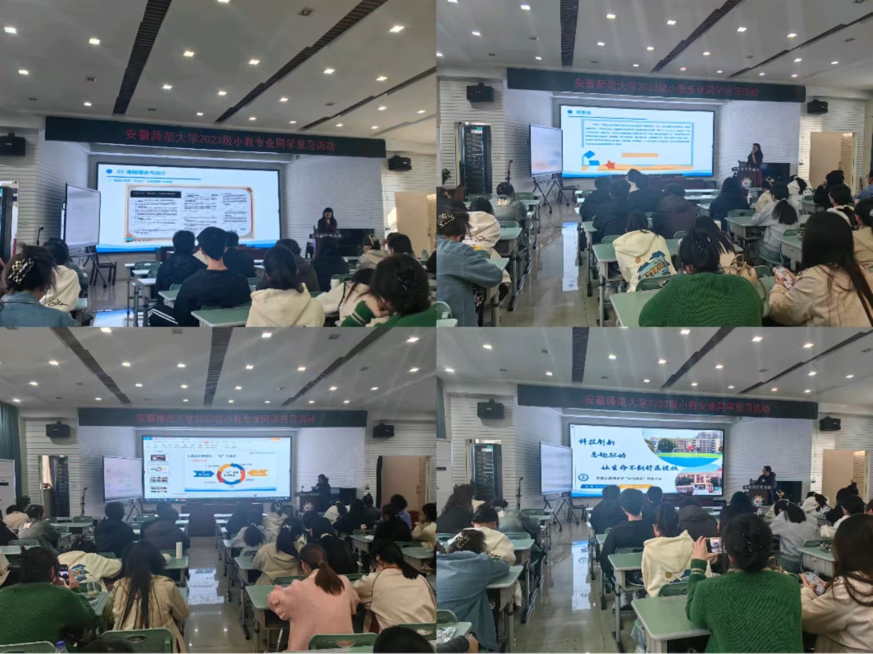 随堂听课结束后,同学们聆听了镜湖小学两位主任的教学特色讲座。第一堂讲座是秦进主任的《镜湖小学“悦成长”课程的实施》。镜湖小学第二课堂“悦成长”课程设置坚持以学生为本,构建多元化课程,并采用融合式教学方法,不断创新评价机制。第二堂讲座是肖敏主任的《科技创新,志趣驱动,让生命不断舒展绽放》。肖敏主任介绍了镜湖小学的“科创教育”特色,镜湖小学以活动促发展,鼓励学生积极参与,以科学、信息科技推动课堂教学新突破,将课后托管与社团课程相结合,共同推动“悦成长”系列课程实施。最后,同学们参观了校园,观摩了学生的大课间活动。