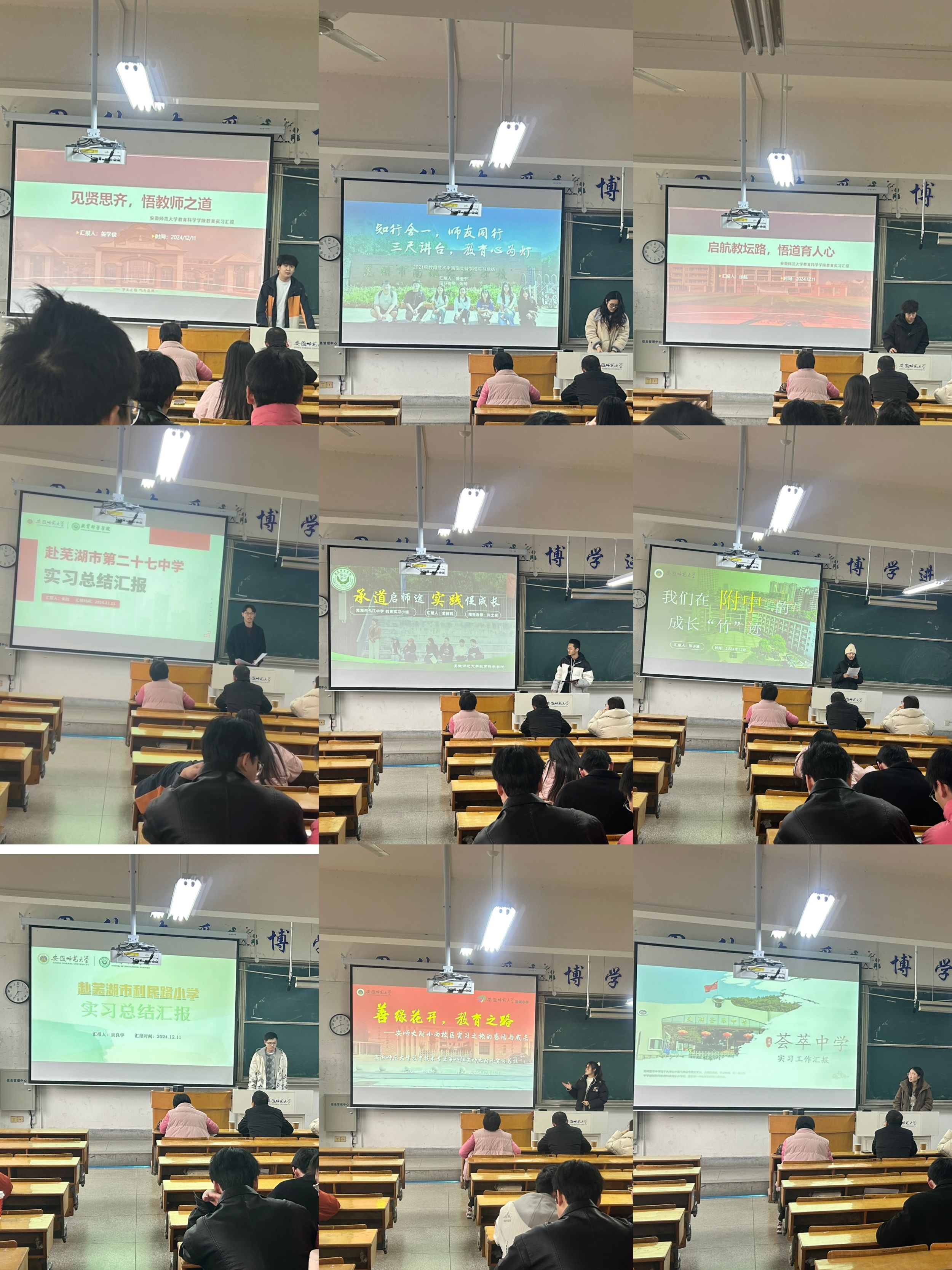 活动伊始,肖文老师简要介绍了本次活动的主旨,强调了总结教育实习工作、交流经验心得的重要性,并指出此次评选活动将为同学们提供一个展示自己实习成果的平台。紧接着,各实习小组代表和申报优秀实习生的同学们依次进行汇报。他们从实习期间的基本情况、教学工作、班主任工作、所遇挑战与解决方法以及未来展望等多个方面详细总结了自己在实习过程中的所思所感,展现了21级教育技术学子勇于实践、不断进步的精神风貌。