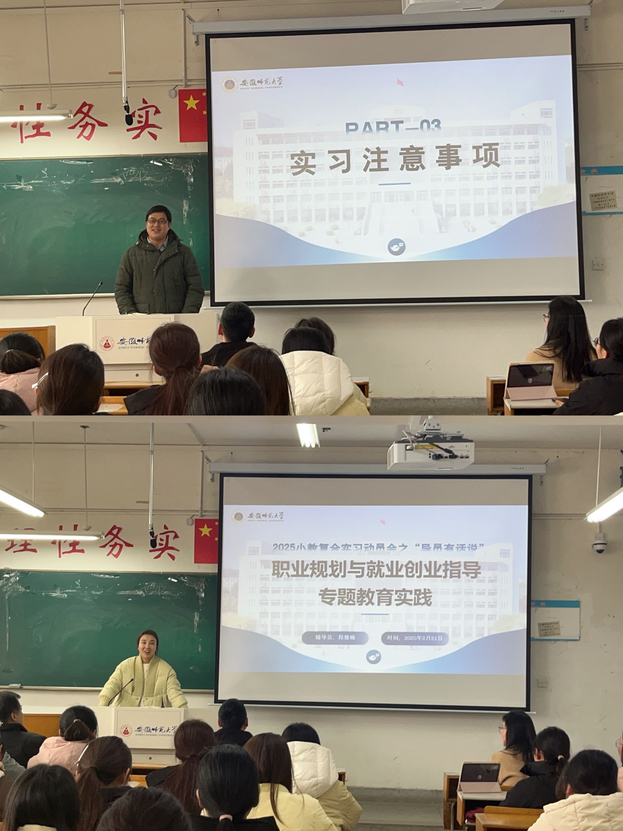 大会第三项,班主任杨俊铨老师强调实习注意事项。杨老师勉励同学们在做中学,将理论应用于实践,致力于成为一名合格教师;提醒同学们重视角色转变,建立良好师生关系;警示同学们遵规守纪,守住底线;积极进取,向上努力。大会第四项,辅导员程雅楠老师对教育实习进行叮咛与指导。程老师指出本次实习的指南针作用,引导同学们把握观察者、体验者、思考者的“三角色”,并强调安全底线,激励同学们抓住机会、反思自我、快速成长,守住教育者初心。
