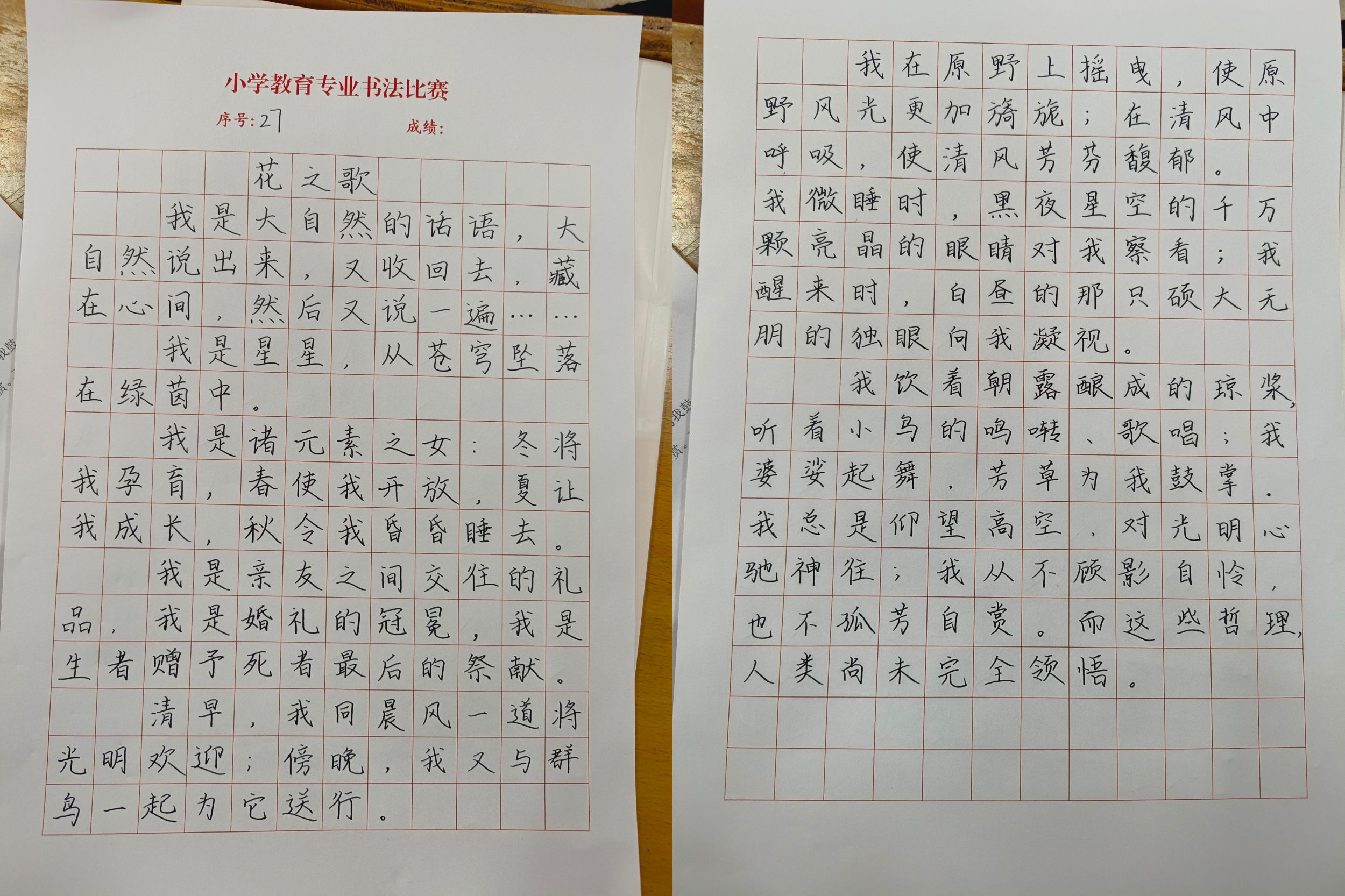 练字修身,书法育人。此次赛事不仅让同学们领悟到书法在小教专业成长中的关键作用,交流了提高书写能力的方法,更增强了小学教育专业学子的教育审美意识。