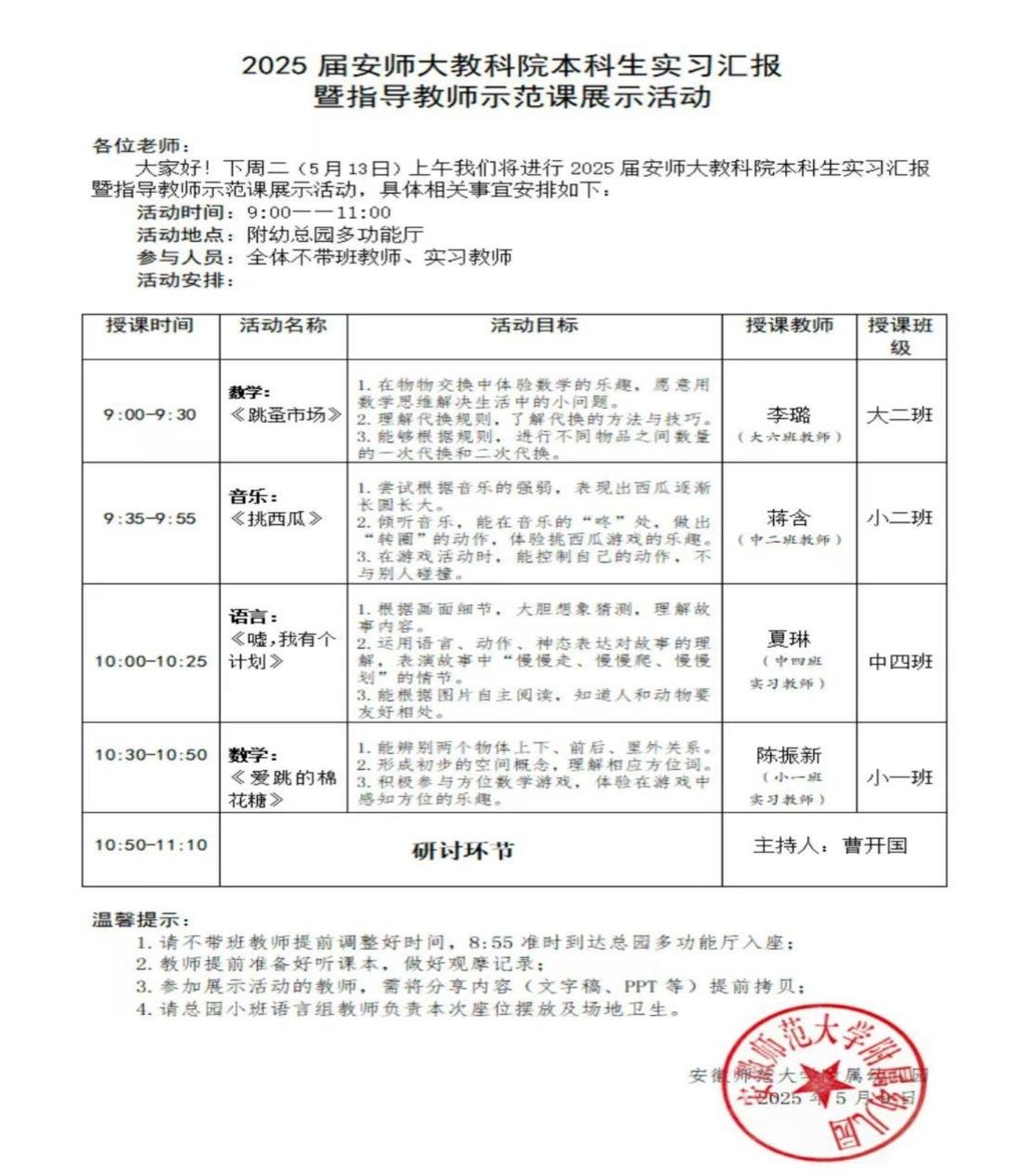 活动在 9:00 准时拉开帷幕,至 11:00 结束。活动期间,幼儿园教师李璐、蒋含,实习教师夏琳、陈振新依次带来了精彩纷呈的示范课。数学课程《跳蚤市场》中,李璐老师巧妙引导学生在物物交换的情境里,深度体验数学的乐趣,逐步理解并掌握换算规则;蒋含老师的音乐课程《挑西瓜》,则让幼儿们在音乐的世界中尽情遨游,通过尝试根据音乐强弱表现动作,充分感受音乐游戏的独特魅力。语言课程《嘘,我有个计划》以及数学课程《爱跳的棉花糖》也各具特色,授课教师们凭借扎实的教学功底和巧妙的教学设计,充分展现了学前教育课堂的活力与魅力。