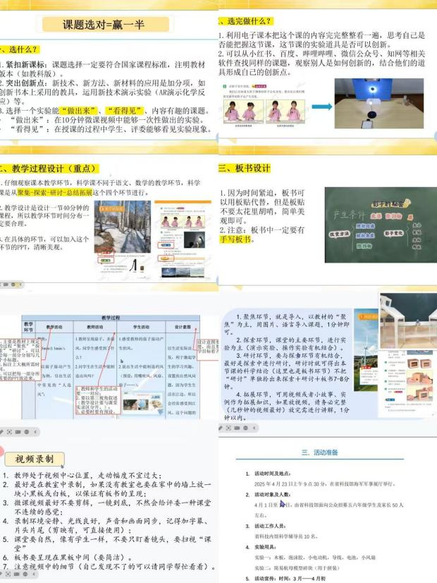 活动第一项,资深引路——学长学姐倾囊相授。2021级余佳遥同学聚焦大赛核心环节,系统分享了成功经验:第一,?精准选题:?紧扣科学课程标准,突出创新性;建议优先参考教科版教材相关内容,广泛研究历年获奖课题,重点关注3-6年级学段课题方向;选题后需深入观摩优秀案例,积极创新实验器具,凝练独特创新点。第二,?教学设计:?强调以学生为中心的设计理念,注重探索求证与实验设计的逻辑闭环。第三,?展示优化:?板书设计简洁居中、PPT制作简约美观。桑瑞瑞同学则重点解析了大赛流程、材料规范与实战策略:第一,?赛程与材料:?大赛分线上初赛与线下决赛,且选题后不可更改。第二,?教学设计核心:?科学课须以学生探索为核心,确保实验现象清晰可视。第三,?视频录制要点:环境安静、光线充足;教师站位居中,侧身板书确保面部可见;推荐在真实教室环境下一镜到底录制。第四,?科技活动方案设计:?主题立足课标并融合时政热点(如航空航天),确保实践性与可行性;方案需结构完整(背景、目标、准备、流程、预案),善用AI辅助框架构建,再进行个性化精修。