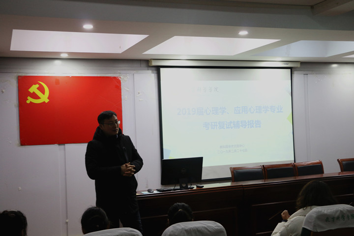 本网讯(教科院 王道阳)2019年2月27日下午,心理学专业在学院学术交流中心举行了心理学研究生考研复试的辅导报告会。报告会由专业负责人王道阳老师主讲,辅导员莫大贡老师以及2015级心理学/应用心理学考生参加了报告会。