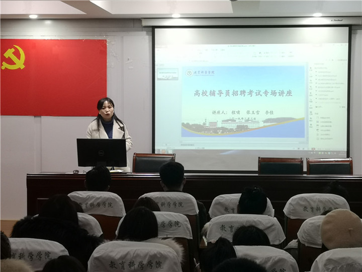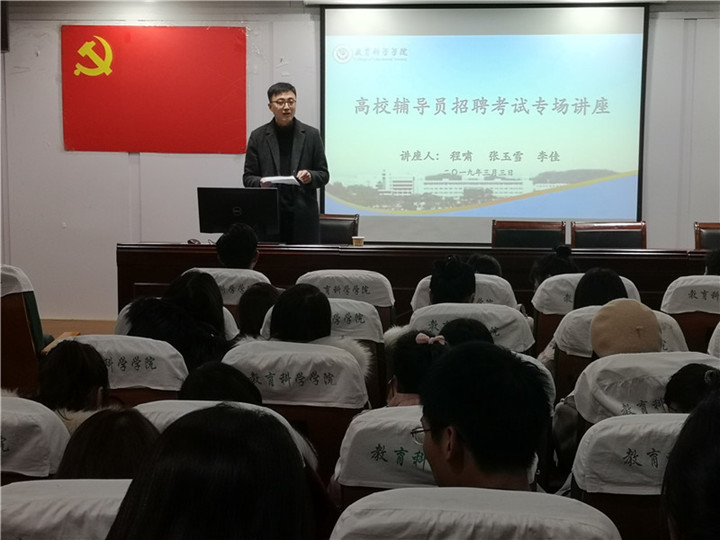 本网讯(教科院 文/占陈芳图/杨银)为进一步促进研究生毕业生就业,提高我院就业率,2019年3月3日星期日下午2点半,我院研究生会顺利举办高校辅导员招聘考试专场讲座。本次讲座邀请了程啸(安徽royal皇家88平台18级本科生辅导员)、张玉雪(安徽信息工程学院辅导员)和李佳(安徽商贸职业技术学院辅导员)三位辅导员主讲,学院准备参加辅导员考试的毕业生以及有备考意愿的学生参加了本次讲座,讲座由陈雅丽主持。