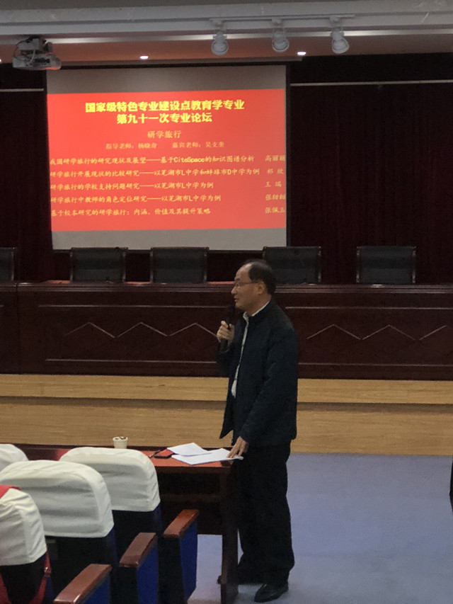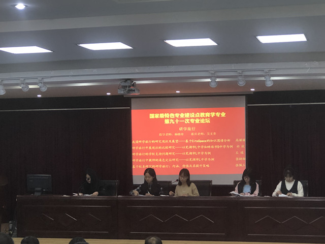 本网讯(文/王萃民 图/于硕)“非学无以广才,非志无以成学,” 为丰富学生的专业知识,提高教育科学素养,2018年11月11日18点30分,第九十一次专业论坛如期在图书馆报告厅举行。本期论坛邀请吴支奎副教授作为点评嘉宾,论坛由17级艾晶晶同学主持,16、17、18级全体教育学本科生参加此次论坛。在主持人强调了专业论坛的纪律要求,并对汇报内容进行了简要的说明之后,专业论坛汇报正式开始。