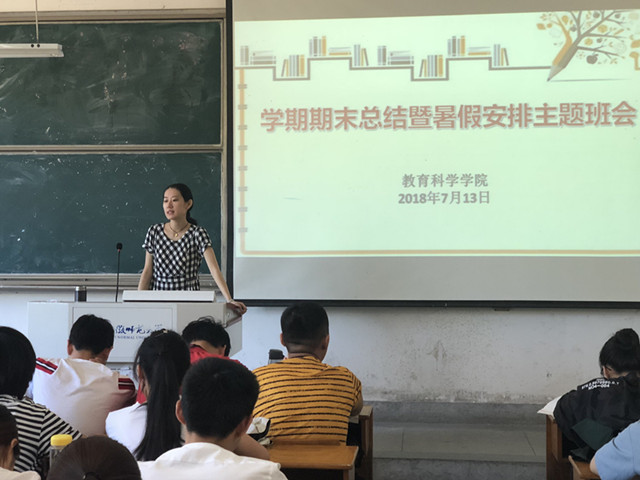 本网讯(教科院 谭茹轩)为切实做好暑期安全教育工作,确保学生平安离校回家,并且引导学生合理安排假期生活,教科院2017级各专业于7月13日上午在田楼8101教室召开了本学年最后一次主题班会,班会由辅导员谭茹轩主持。