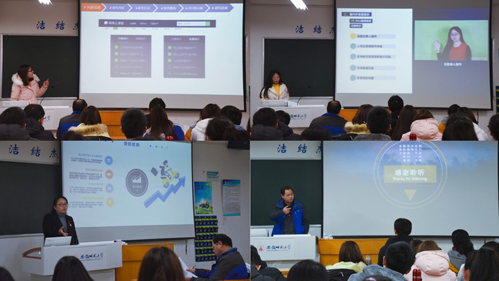 报告会开始,刘和海老师简述了创新创业项目的意义及会议总体流程,要求各项目队长依次从项目研究背景及意义、研究内容、研究方法、技术路线、进度安排等方面进行十分钟左右的开题汇报。首先进行答辩的是朱丹丹同学,她的选题是《PPT微视频学习网站设计与开发》。她指出目前PPT网站开发中普遍存在针对性、纯技术、纯理论的问题,不利于学习者学习,拟通过微视频开发与网站开发两个维度进行研究,以提高教学的有效性。她的汇报采用思维导图呈现,有理有据,完整清晰。詹雅灵同学汇报主题是《自动化微课制作系统选题》,通过对国内外微课制作系统的现状梳理,从VS-Mini微课系统、易捷微课制作系统等中寻找自动微课制作系统的设想:自动化影音同步,自动化讲师和自动化字幕等,汇报过程简洁,研究思路清晰,研究目标明确。最后是范晨晨同学的创业项目:《青芒教育资源有限公司》,重点汇报了创业公司的服务项目、特色与优势,并进行了SWOT分析,强调了其发展设想与战略规划,汇报过程层层推进,主旨明晰,尤其能结合专业需求,做到有方向、有计划、有策略地发展公司。开题中,三位指导教师分别从不同角度对每个开题汇报提出了中肯的建议与意见,如表达不够准确,想法不能过于空洞,研究目标要更加明确,问题来源于实际,要重视项目的可行性等等。