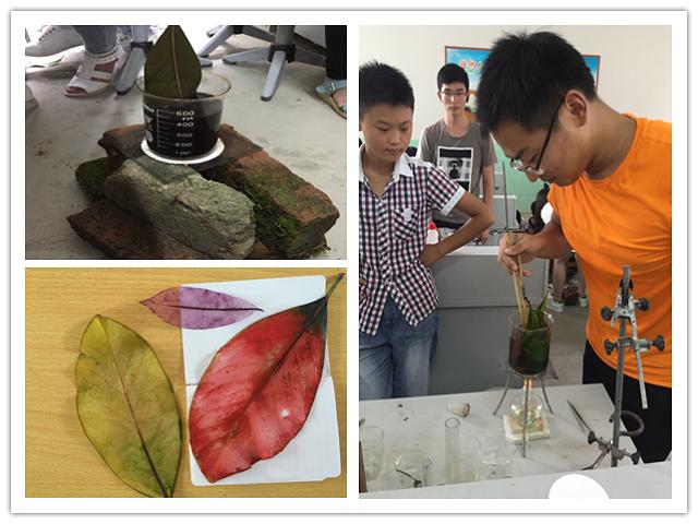 河图中心学校的实验设备较为落后,没有足够的三脚架用于制作叶脉书签。面对种种阻碍,学生们没有退缩,积极地和团队成员一起想办法,就地取材,用砖头搭建支撑烧杯的支架。支架的问题解决后,他们纷纷点燃酒精灯,开始制作书签。学生们将清洗干净的叶片小心翼翼地放进存有化学药品的烧杯中等待,却由于仪器设备和其他突发状况,导致原来半小时就可完成的环节一拖再拖。伴随时间的流逝,一些学生失去了耐性,经常问还要多久可以完成。但当队员们与之商量是否明天再继续时,很多同学表示希望今天就可以完成,随即耐心等待。不久之后,他们终于拿到了煮好的叶片,迫不及待地开始刷叶片,最后拿到自己亲手制成的书签时,喜悦之情溢于言表。