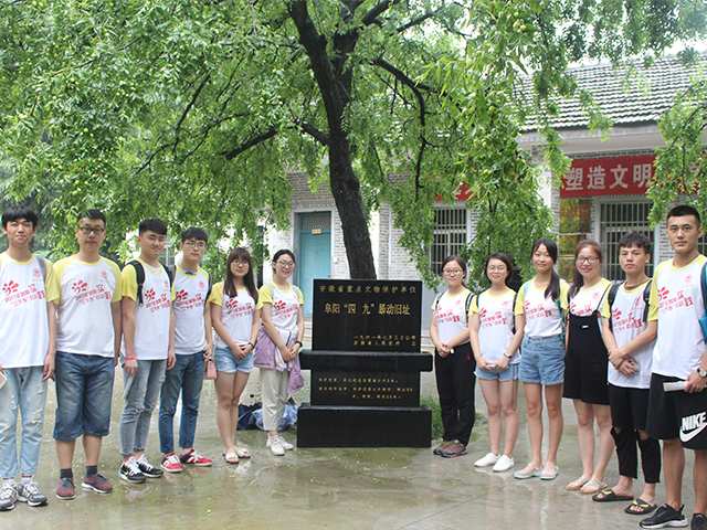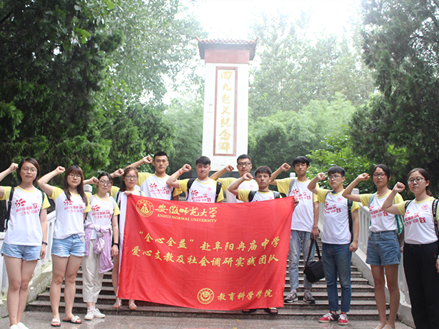 本网讯(教科院 黄玉绒 丁如)微雨东来,凉风习习。为促使当代大学生更好地传承战争时期人民英雄的伟大奉献精神,响应国家对青年学生的热切期盼,教科院“全心全益” 赴阜阳冉庙中学爱心支教团队12名队员在阜阳市颍东区冉庙中心学校校团委书记高川老师的带领下,于7月16日上午到达阜阳“四?九”起义纪念馆开展了以“缅怀先烈,面向未来”为主题的红色之旅。