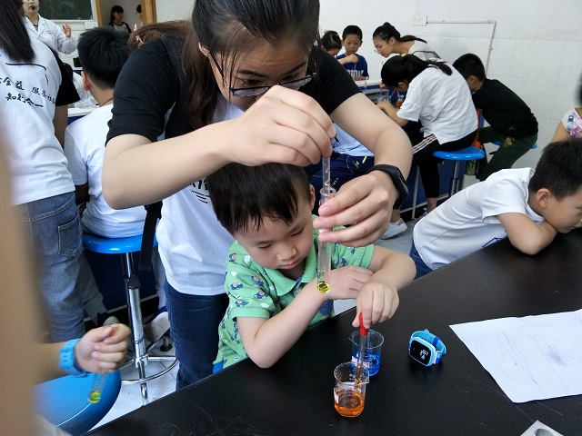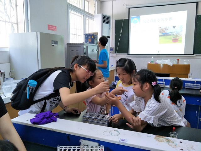本团队的另一组成部分,与芜湖市自然科学小博士夏令营进行合作,在为为期8天的自然科学夏令营中的孩子们做团体辅导活动的同时,配合辅助夏令营进行孩子的教学活动。7月2日,是夏令营活动开展的第一天,孩子们都是第一次见面,互相不够了解,因此团队计划在夏令营的第一天开展一系列“破冰”团体辅导活动,活动刚开始,孩子们不太在集体中展现自己,在一个简单的打招呼游戏完成之后,很快就互相熟悉起来了。接下来进行的相识接龙游戏,让刚刚熟悉起来的孩子们通过肢体接触增进彼此之间的联系,学生之间的陌生感大大减少了。最后进行的无家可归的小游戏,让孩子们在游戏中体验到团体支持的重要性,也体会到了自己是团队中的一份子,这对于他们每一个人来说,都是一笔财富。