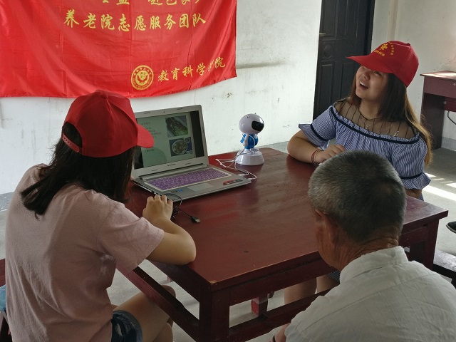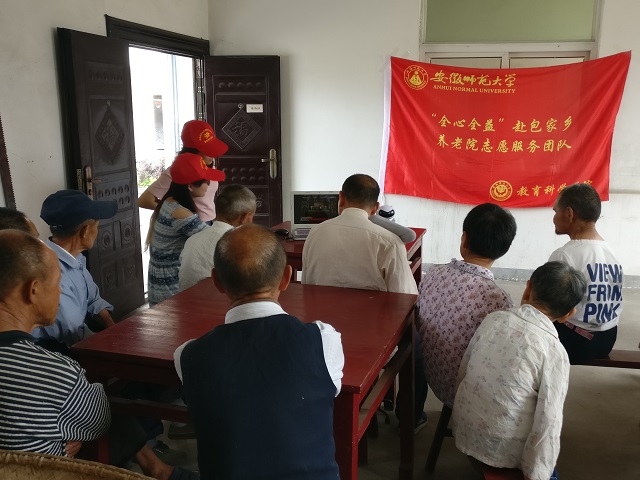 上午八点,社会实践队伍抵达包家乡养老院,同学们迅速布置好场地,把老人组织到一起,播放幻灯片,采用志愿者讲解的的方式进行心理知识宣讲,成员们对每一张图片都进行了生动易懂的讲解。在这个过程中也不断地与老人互动,交流,与此同时其他同学及时收集老人的问题并做出反馈。心理知识宣讲结束之后,一部分同学陪伴老人观看心理视频,另一部分实践团队的成员们就收集老人的信息和问题,积极讨论。