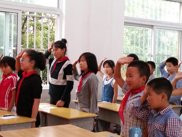 2017年7月1日,恰逢中国共产党建党96周年纪念日,团队成员以此为契机开展了一次以“童心向党”为主题的少先队员队会。主题队会上,三分钟的《画说党史》短片通过直观多彩的图画播放向孩子们扼要地呈现了自近代以来中国共产党经历挫折、汲取教训并不断完善的成长史,以及一代代党的领导人的更迭与作为。随后就小学生作为少先队员的实际身份,阐明了中国共产党与中国少年先锋队的紧密关系,带领他们回顾了少先队的基本常识。最后,所有少先队员全体起立,面向国旗,敬下庄严的中国少年先锋队队礼,以表达对党最真挚的祝福与最崇高的敬意。