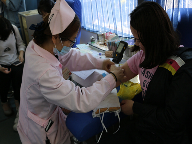 在宣传阶段,我院学子就对献血活动展现出了高度的热情,踊跃报名参加。献血活动现场,广大同学在献血车前排起了长龙。同学们在工作人员的带领下有序地进行相关信息的登记与表格的填写。医护人员给献血同学进行了简单的献血常规检查后,同学们便进入献血车开始正式献血。虽然天气很炎热,阳光强烈得让人睁不开眼,但却阻挡不了同学们献血的热情。献血车上,医护人员为献血同学做着最后的准备,并安慰一些害怕的同学,整个车厢都弥漫着爱心与温情的气息。同学们脸上洋溢着的幸福、满足的笑容,充分向大家传达了奉献的真谛——帮助他人,快乐自己。活动一直持续到下午,但前来献血的同学依旧热情不减。“献血可以帮助他人,给那些需要的病人生的希望,我们应该积极去做才对。”一位参与献血的同学这样说。从他们的身上表现出了当代大学生的爱心风采和对社会责任的担当,值得每一个年轻人学习。