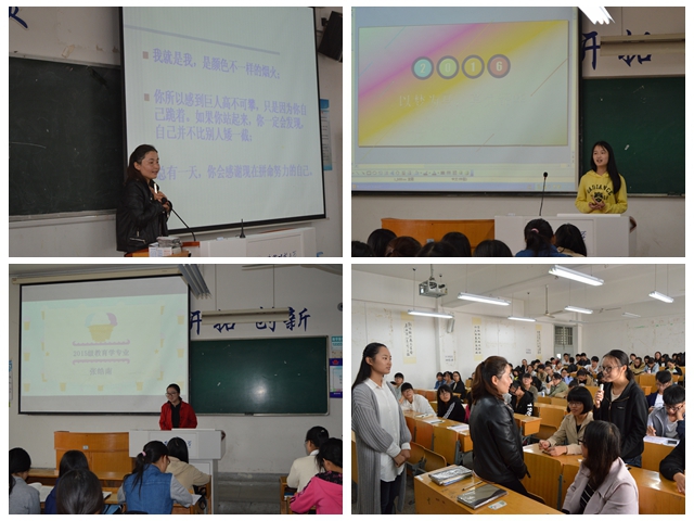 本网讯(教科院 徐如瑾 王安琪)为引导大一新生适应大学生活,合理规划大学生活,学院于10月15日上午在田楼8301与8408教室分别开展了新生青春导航宣讲事迹活动。2016级全体新生和辅导员随小莉与朱雨雁老师参加了宣讲会,主要宣讲人有现学生会主席14级学前教育专业叶品、15级教育学专业张皓南、校自强之星13级学前教育专业朱露与全国十佳大学生12级心理学专业的古孜里努尔。