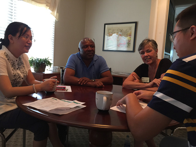 20日上午,张如华书记与龚伟老师与布莱诺大学教务副校长Dr.Nancy Krippel以及教育系主任Dr.Eugene Williams进行了会面,就学生未来两年的学习安排和生活起居等问题进行了交流讨论,Dr.Nancy Krippel首先对于安师大师生的到来表示了热烈欢迎,她向安师大的老师简要介绍了布莱诺大学的办学特色以及教育理念,并就学生未来的英语学习和课程学习提出了要求和建议。随后,Dr.Eugene Williams就本学期的学习计划以及在学分修习和考核评价等方面进行了详细说明。