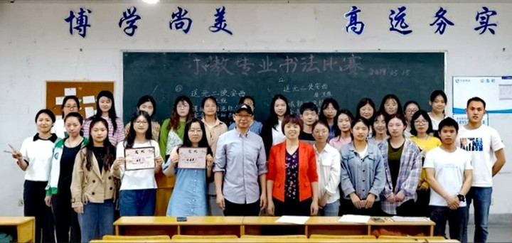书法练习和比赛是小学教育专业开展的专业活动系列之一,旨在帮助同学们练好教学基本功。从大学一年级到四年级,学院给每位同学配备字帖和小黑板,每周提交作品并展示评分,每个学年度进行一次比赛和评选活动。一分耕耘一分收获,经过坚持不懈的练习,同学们的书法水平有明显提高。