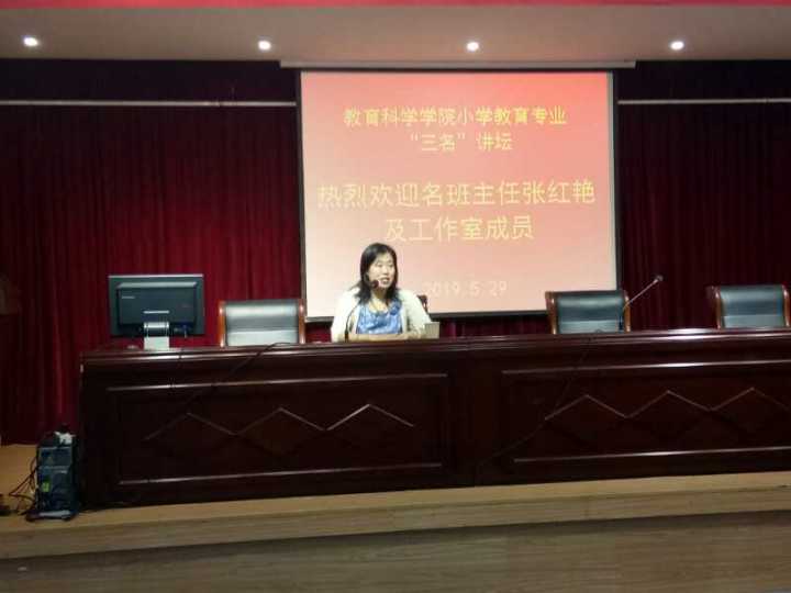 本网讯 (教科院 王利群) 5月29日, 安徽省特级教师、教学名师,狮子山小学张红艳老师做客“三名”讲坛,给我院小学教育专业全体同学开展了一场精彩的讲座。讲座由专业负责人王芳老师主持,小学教育专业全体同学参加了此次讲座。