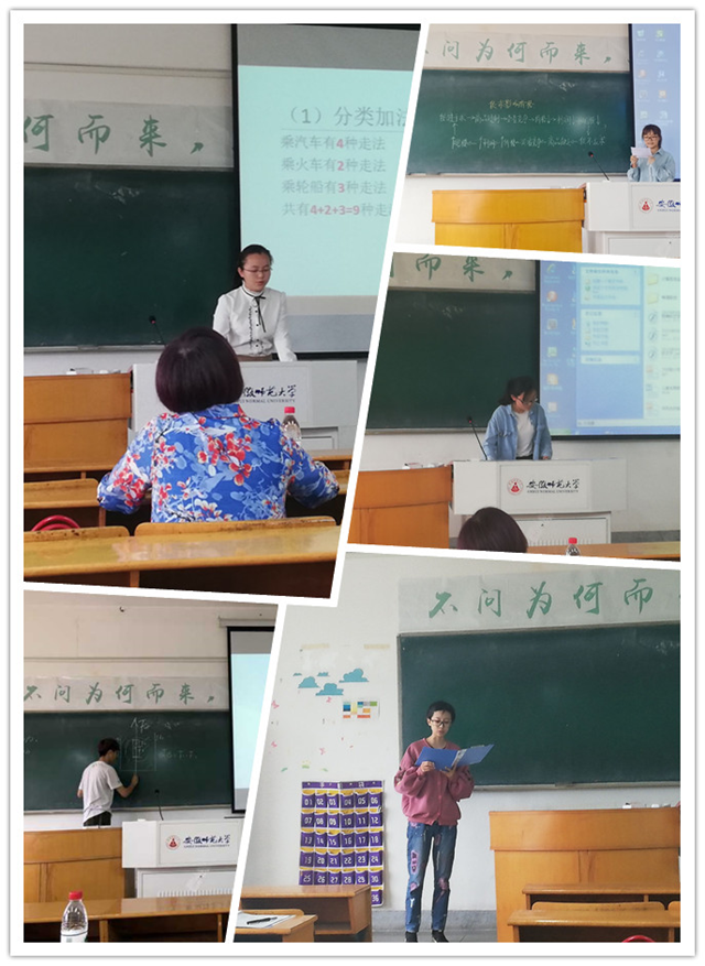 比赛中,李雅馨同学授课时语言幽默风趣,板书工整详尽,整体上授课思路清晰颇有条理,授课结束后也赢得了观众们的一致喝彩;吕可同学在授课中,尽显未来年轻教师的风采,不管是语言的生动讲述,还是黑板上的板书的独特思路均体现出了未来教师的创新以及敬业精神;俞晓雨同学在授课过程中以点破面,并用简练的语言说出重点,获得了观众及评委的阵阵掌声。刘星辰同学和黄跃程同学则独辟蹊径,从生活中鲜明的事例入手,深入浅出地将知识点融进形象的生活实践中,引起在场同学们的强烈共鸣。
