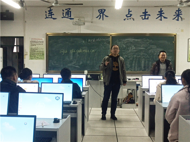 12月4日两时许,17级教育技术全体同学前往南瑞实验学校开展第二次见习活动——观摩二年级SCRATCH编程课程。授课老师首先演示了如何设置参数让窗口中的对象正确地移动到指定的位置,接着老师提出一个问题:如何让窗口的对象触到边缘向反方向返回?并进一步引出了在编程中负数的应用,用简单易懂的解释帮助二年级的孩子理解。讲解完后,老师将时间交给学生们进行实际操作,助教老师进行实时的指导。课程结束后,杨滨老师对观摩课做了点评发言,指出观摩不是简单的观看,观摩课找好观测点、做好记录,学会吸取一线教师的教学经验和方法是关键,要带着问题观摩才能有所收获,有所发现。随后,17级教育技术学同学与学校的一线教师进行交流讨论,同学们主要就如何解决学生学习差异,如何进行有效地课堂调控,如何对于超前的知识进行讲解等问题与老师们进行了讨论。老师提到创客教育的核心是开放、交流和创新,这是上课的根本依据,创客课程的开发培养就是为了培养学生的逻辑思维能力,而不是为了成绩。一线教师所做的是为了让创客教育在中小学可以普及开来,让创客教育成为一种“潮流”。活动最后,席鹏老师对此次活动做了简要总结,希望同学们能够通过此次见习活动对于自己的专业乃至以后的职业有更深刻,更全面的认知和思考。下午五时许,活动圆满结束。