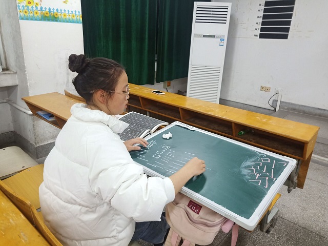 “三字一话”是师范生的基本技能之一,其中粉笔字作为师范生的基本技能之一,更是教师从业的基本功。为推动师范生自主进行粉笔字训练,从而提高师范生粉笔字书写能力以及板书设计能力,促进师范生教师专业技能的提升,教育学专业不断摸索,加大投入,将练字环节作为特色实践课程《教育研习》的重要模块,成立了以学生为主体的练字工作小组,建立了包括组织安排、练字晒字流程、讲字和评字、考核评价在内的一整套练字课程设计,并持续改进与健全相关制度。目前,教育学专业同学从大一第一学期开始,就会收到专业分发的人手一张的小黑板,利用课外时间自主练习,每周在学院一楼晒练字成果,每次晒字由工作组成员分工进行评阅、描红、修正,并做详细过程性记录,在每学期期末进行讲字活动和成绩总评。同时从2018年下半年开始,除粉笔记练习外,进行钢笔记字的练习。由专业购买书法名家字贴,每位同学每天完成一页纸的临摹,两周提交一次临摹本给工作组进行评价。绳锯木断非一朝一夕,书法水平的提升是一个循序渐进、潜移默化的过程。正是由于这种日积月累,同学们粉笔字和钢笔记书写的各方面能力才得以发展,书写的流畅度、字体的美观性都得到了显著提升。