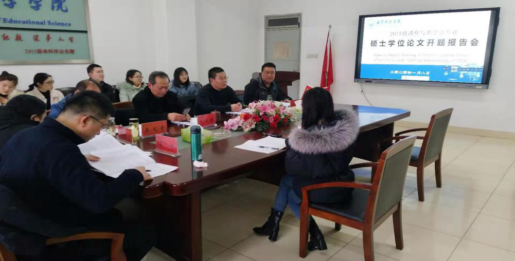 本网讯(教科院 文/陈学超 图/潘亚萍)在本学期结束之际,为了能够更好地了解18级研究生论文准备的进展情况,课程与教学论于1月8日下午在教科院308会议室开展了硕士研究生学位论文开题报告会,莅临本次开题报告会议的有阮成武教授、段兆兵教授、杨晓奇教授、吴支奎教授、马家安副教授、李卯副教授。此外,课程与教学论专业18级和19级的研究生到场聆听学习。杨晓奇老师担任本次开题报告会的主持人。