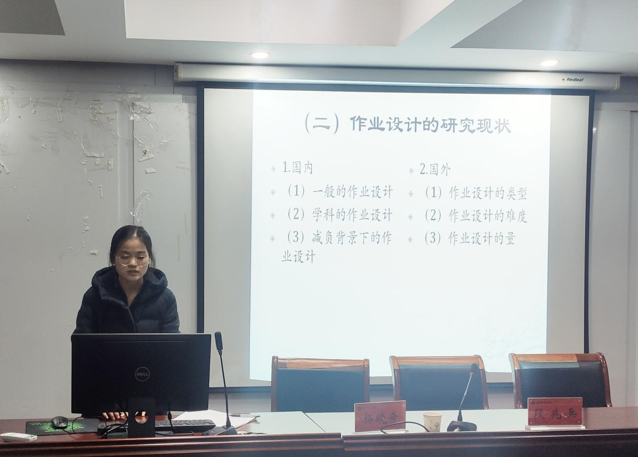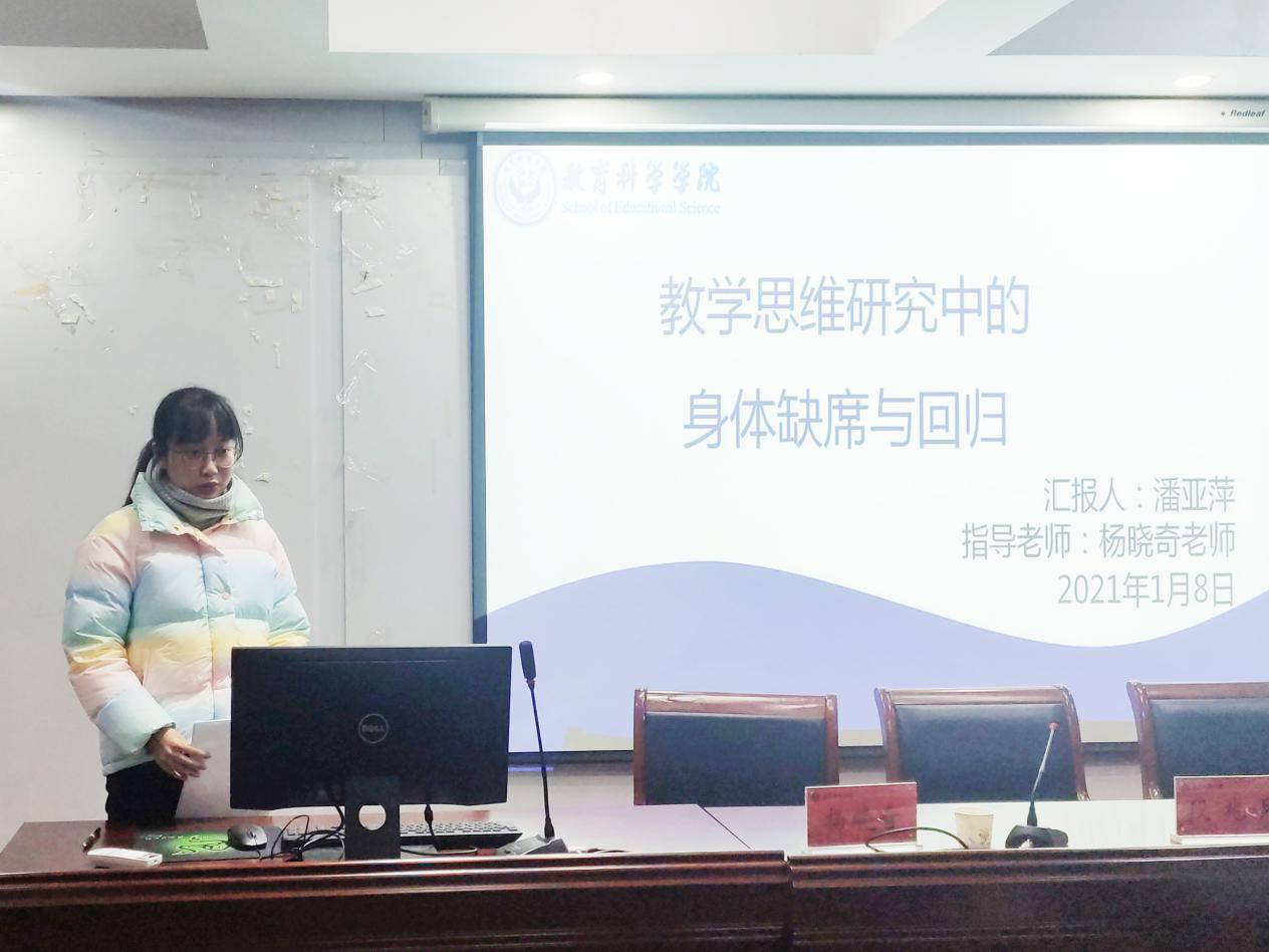 陈学超同学的论文选题为《高中教师对统编教材教学适应性研究——以语文教师为例》,她从文献综述、课题依据、研究内容和创新之处四个方面进行了汇报。汇报结束后,李卯老师指出为了使论文概念更加明晰,建议将题目改为“高中语文教师对统编教材教学适应性研究”;马家安老师建议在研究方法方面,应当使课堂观察法在提纲中进一步呈现;吴支奎老师建议可以通过调查学生对统编教材的适应性来给予教师反馈;段兆兵老师建议应就统编教材这个概念进行学术性的界定。邹秀秀同学的论文选题为《基于教师教学机智生成的教学时机研究》。汇报结束后,马家安老师认为应当注意教学时机的偶发性;段兆兵老师建议可以就“课程教学时机的抓捕与应用”进行深化研究;杨晓奇老师建议应当加强对教学时机与教师教学机智关系的把握。郝倩倩同学的论文选题为《小学初任教师与经验教师教学理解对比研究》,汇报结束后,李卯老师建议应对教学理解的概念界定清晰;吴支奎老师认为应当指出判断教师教学理解程度的标准;杨晓奇老师建议明确教学理解和教学要素理解的类型。